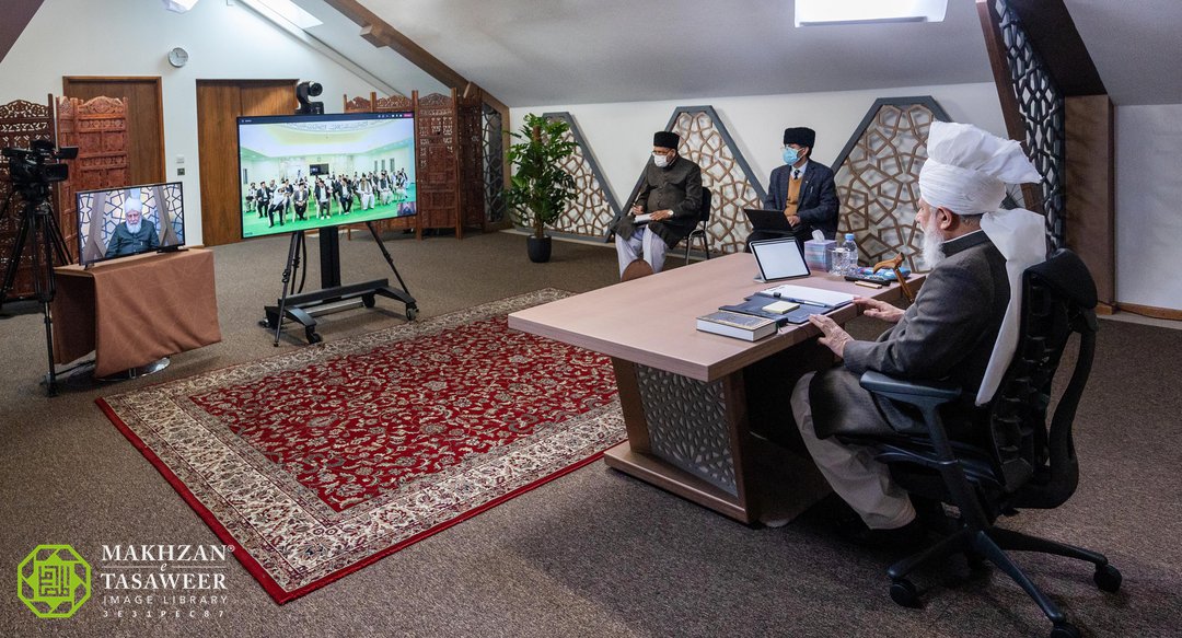 His Holiness presided the meeting from MTA Studios in Islamabad, Tilford, whilst the Amila members, including representatives of Majlis Khuddamul Ahmadiyya and Majlis Ansarullah, joined the meeting virtually from the Baitul Muqeet Mosque in Auckland, New Zealand.