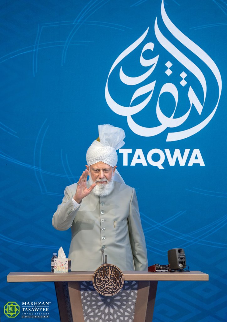 His Holiness presided over the concluding session virtually from the Masroor Hall in Islamabad, Tilford, whilst more than 42,000 people gathered at the Jalsa site in Mendig, Germany.